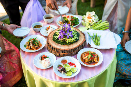 An elegant Thai dinner setting with ornate dishes of seafood curry, stir-fried vegetables, and crispy fish
