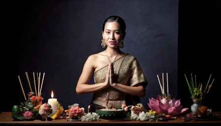 Thai Woman in Traditional Dress Performing Greeting. Generative ai. High quality illustration