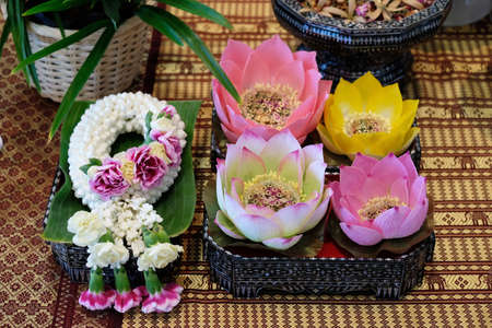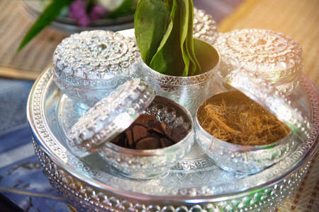 Beautiful flowers decoration on Engagement gold bowl for Thai engagement ceremony.Thai wedding culture tradition