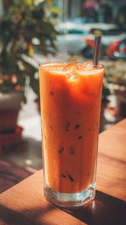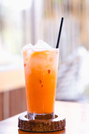 Thai ice tea in glass on table in coffee shop, Thailand.