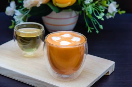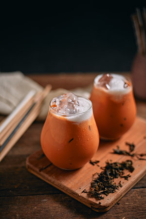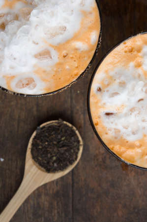 Thai Milk Tea, Milk ice tea, Cheddar is a traditional Thai drink that has long been popular, fresh and sweet dessert on a wooden saucer, vintage wooden table in cafe.