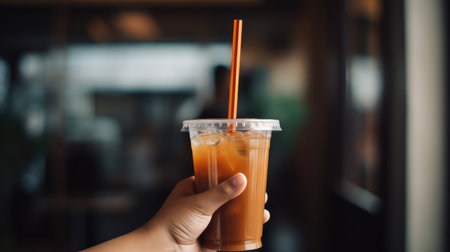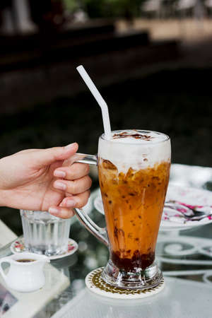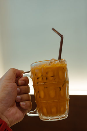 Hand holding glass of iced Thai milk tea. Thai milk tea is a traditional Thai drink that has long been popular.