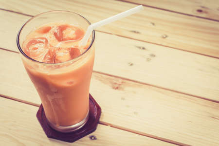 A glass of Thai milk tea on wood table at cafe, Thai milk tea, is a traditional Thai drink that has long been popular.