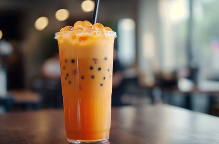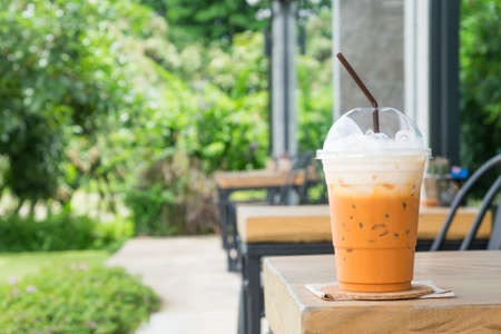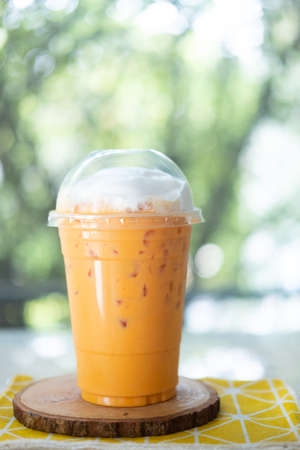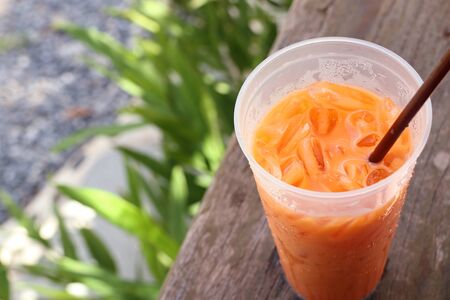 Ice Thai tea in clear plastic cup famous beverage drink traditional on wooden table in nature cafe, copy space