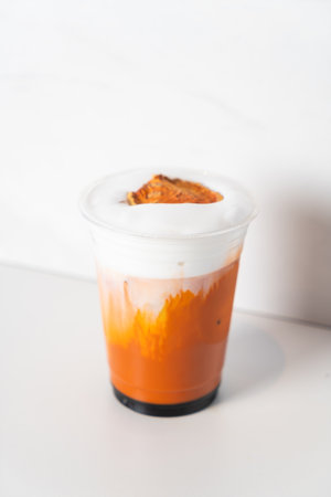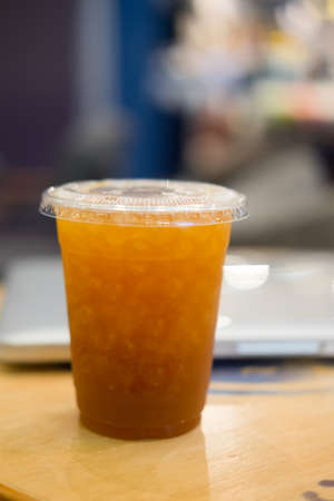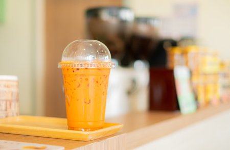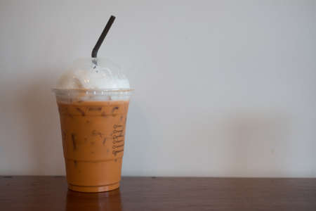 Milk ice tea in takeaway plastic cup on table in cafe, Thailand