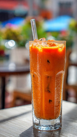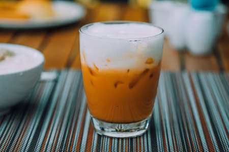 Fresh prepared sweet ice cold thai milk tea in local restaurant on Koh Mook island. Traditional thai cuisine made of fresh ingredients.