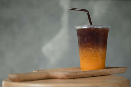Glass of iced espresso with fresh orange juice two layer of combination. Relaxing drink with selective focus.