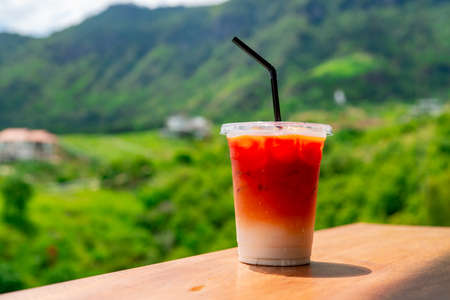 Iced milk tea with ice in a plastic cup Laying on a wooden table behind is a view of the mountains and the bright sky.