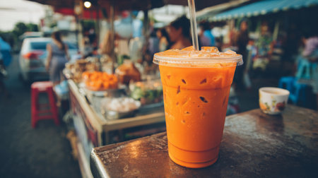 A vibrant cup of iced Thai milk tea sits on a metallic counter, capturing the essence of a bustling street food market. The warm sunset light highlights the vivid orange color of the drink, making it an appealing sight.