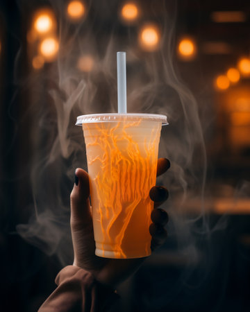 Female hand holding Bubble tea Asian sweet tapioca pearls drink night city.