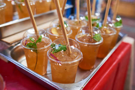 Ice tea and ice coffee in mason jars on table and background of restaurant in Asia.