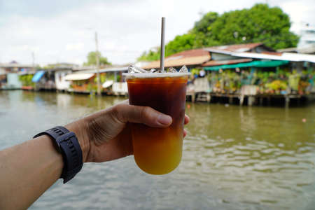 Holding a cup of iced coffee by the canal in the community,man holding a cup of iced coffee by the canal