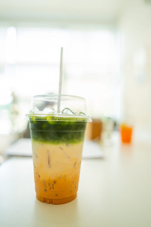 ice coffee latte mixed with milk and green tea in a takeaway cup on the table