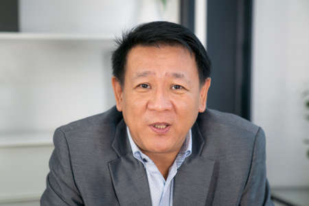 portrait of senior asian businessman talking in meeting room with online meeting by vedio camera