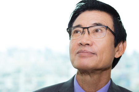 Thoughtful senior Asian businessman looking up and dreaming of success. Pensive entrepreneur in eyewear standing in corridor