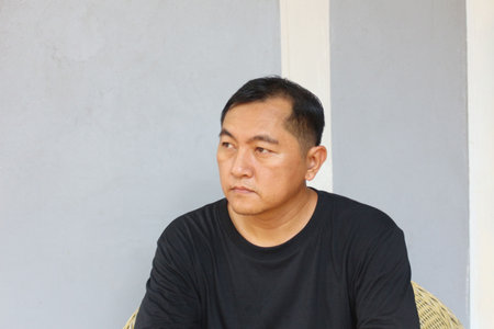 A thoughtful man in a casual black shirt sits indoors, exuding a relaxed yet serious demeanor. His pensive expression captures quiet moments of reflection.