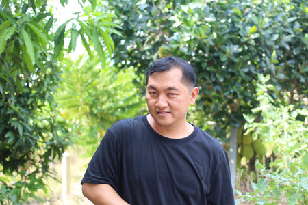 An Asian man aged about 30 years old, looking good, wearing glasses, wearing a white T-shirt Sitting in a small garden at home