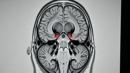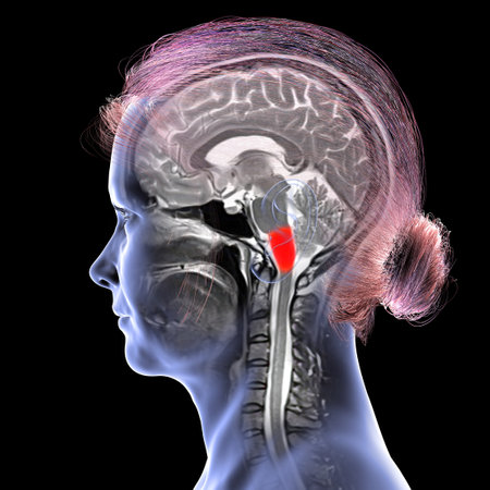 Medulla oblongata highlighted in human brain, colored MRI composite image and 3D illustration. Controls breathing, heartbeat, and other vital autonomic functions.