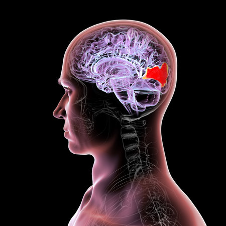 Human brain with highlighted cuneus gyrus, 3D illustration. A visual processing area in the occipital lobe involved in attention, vision, and spatial orientation.
