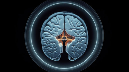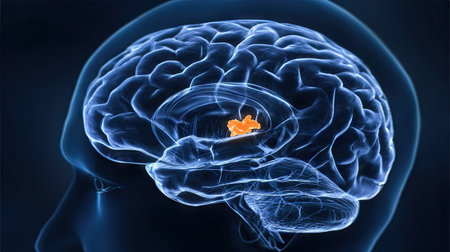 This illustration presents a detailed view of a human brain, highlighted in a translucent style against a dark backdrop. The image utilizes blue and orange tones to emphasize brain structures. The composition, likely computer-generated, is suitable for educational, medical, and scientific publications, as well as conceptual designs.