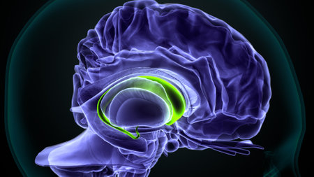 Brain dorsal striatum anatomy, 3D illustration. The dorsal striatum consists of the caudate nucleus (orange) and the putamen (yellow). Lateral ventricle is colored blue, amygdala is green