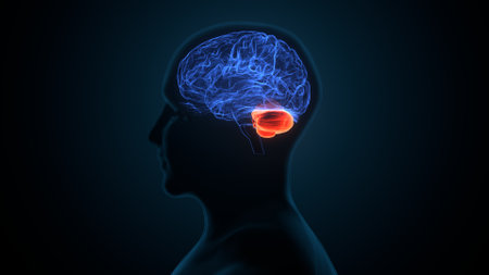 Cerebellum, 3D illustration and colored MRI composite image showing brain anatomy with highlighted cerebellum, important for coordination, balance, and motor control.