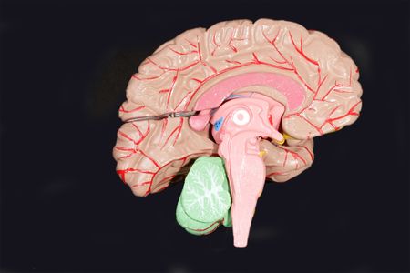 This vibrant image showcases an anatomical model of the human brain, providing a clear view of its intricate structures and components. Ideal for educational and scientific purposes.