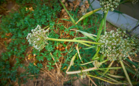 White flowers on onions in the vegetable garden. Close-up