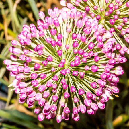Close up of the blooming purple ornamental onion (Allium hollandicum).