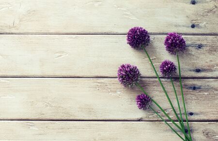 Allium flowers on natural wooden background. Flat lay. Copy space