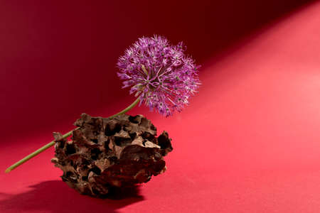 Minimalist floral still life with purple allium on a wood bark against a bright red background. Giant onion decorative plant on a floral theme banner.