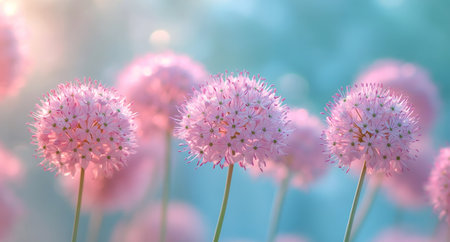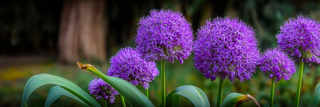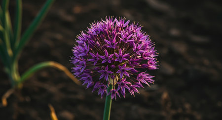 Purple allium flowers blooming in summer garden at sunset, creating a vibrant and colorful scene