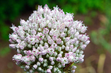 Onion flowers in bloom in summer. Nature.