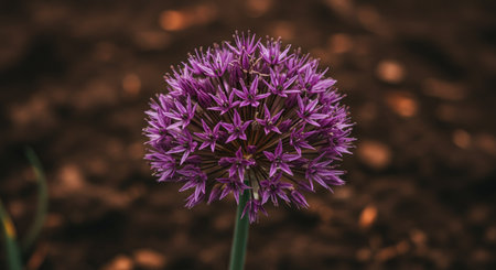 Purple flower of onion on the background of soil. Close-up.