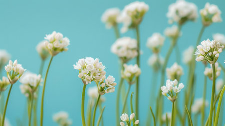 White flowers with delicate petals bloom against a bright blue backdrop, their long stems reaching upwards, creating a serene and minimalist floral scene.