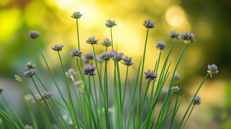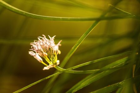 Spring flower chives on sunny day. Defocused background.