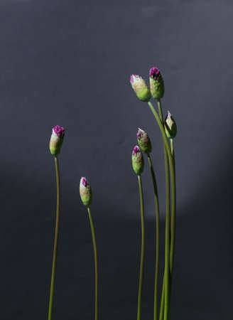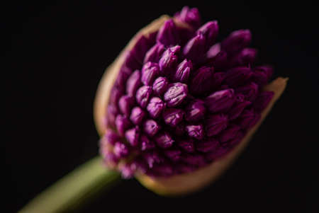 purple white flowers round onions on a black background