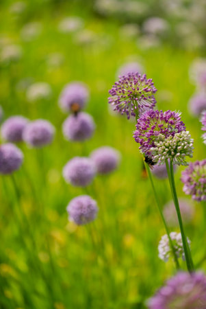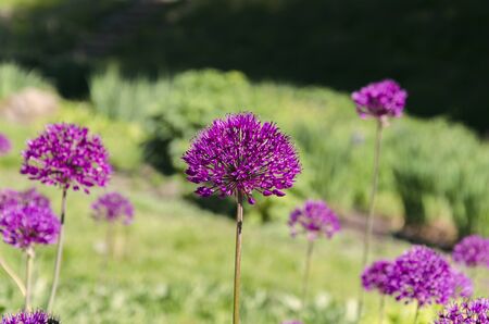 Beautiful view of purple and white allium flowers in the natural perennial garden
