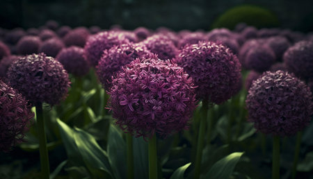 Vibrant floral garden with globe-shaped decorative violet alliums under tranquil evening lighting.