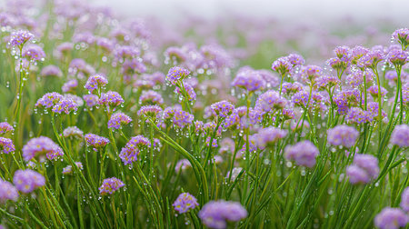 A panoramic wide view of Statice field growing closely together under light drizzle soft raindrops on leaves ultra realistic photography natural daylight cinematic wide composition lifelike natural scene