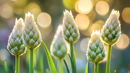 This enchanting image captures dewy blossoms illuminated by soft morning light, showcasing nature's beauty and serene atmosphere in vibrant colors.