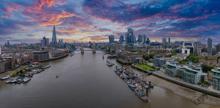 Aerial view of London skyline,The Shard, Tower Bridge, River Thames at colorful sunset, urban city landscape, boats sailing, iconic landmarks. United Kingdom travel destination. Drone flight