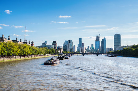 Thames River Embankment, London | UK - 2021.06.26: Tugboat team at the Thames River