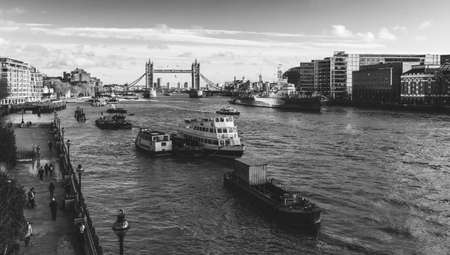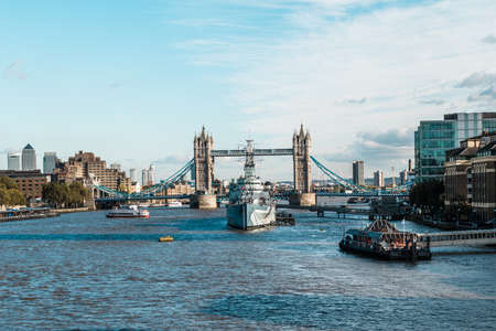 London - September 05 2019: View of the river Thames with the iconic Tower Bridge in the background and multiple ships including the HMS Belfast, London September 05, 2019