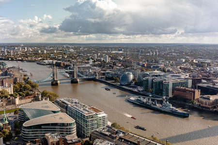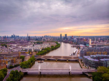 Aerial view of London skyline at sunset, United Kingdom with Tower Bridge