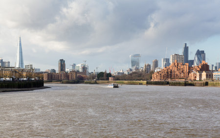 LONDON, UK - JANUARY 30, 2016: Skyline of the main office buildings in City of London with Thames Clipper ferry boat taken from Canary Wharf, Docklands, London, England