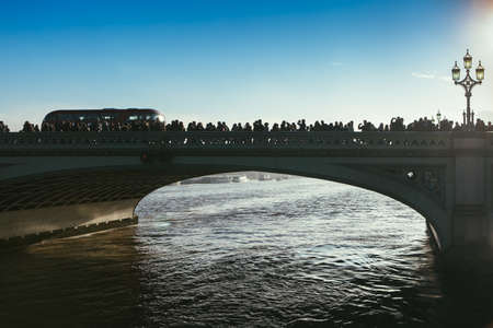 Beautiful day for tourism and sightseeing along the Westminster Bridge in London, UK. Canvased in this photo are Big Ben, River Thames, Westminster Bridge, and the classic red double-decker bus.
