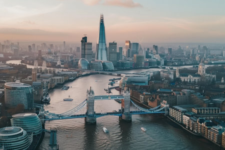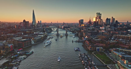 Aerial view of London skyline,The Shard, Tower Bridge, River Thames at colorful sunset, urban city landscape, boats sailing, iconic landmarks. United Kingdom travel destination. Drone flight