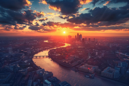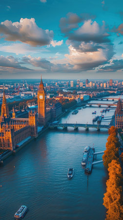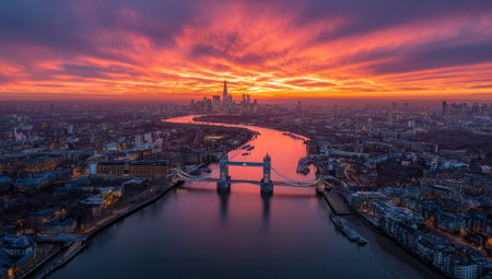 River Thames reflecting London cityscape at sunset, with The Shard and Tower Bridge standing out in the warm golden light, creating a breathtaking panorama of Englands capital. Drone flight