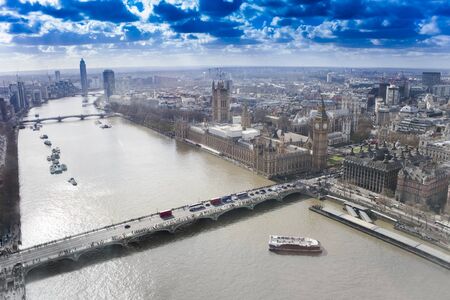 Aerial view of the river Thames with Westminster Bridge, the Big Ben and the Parliament, London, England, UK